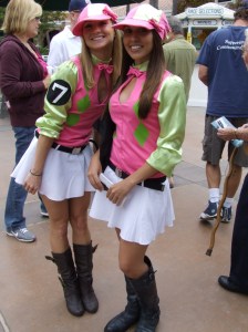 The day of the Classic, my main job was to get as many shots of people around the TVG signs as possible. The network also had a giveaway of TVG flip flops and a full field of pink-silked jockey girls to distribute them.